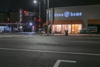 A vibrant cityscape of Los Angeles at night, showcasing the bustling city life. The image captures a crosswalk with people walking across it outside a local business, illuminated by streetlights and the glow of nearby restaurants. The classic architecture and urban design of the surrounding buildings add to the charm of this metropolitan area. The asphalt road surface and curbs provide a safe infrastructure for pedestrians. This image perfectly represents the dynamic nightlife and unique atmosphere of Los Angeles, California, USA.