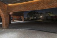This stock photo features a captivating view of a city at night in Shanghai. The image showcases an empty walkway illuminated by artificial lights, highlighting a beautiful arch between two brick walls. The classic architecture and industrial ambiance give off a sense of urban design. The composite material of concrete and brickwork adds a touch of character to the scene. The image captures the essence of city life and showcases the real estate possibilities in this thriving city. The dark shades and tints create a mesmerizing atmosphere, perfect for representing urban warehouses and storage facilities. Enjoy the intriguing charm of this art district.
