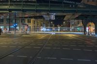 This image captures the vibrant city of Berlin, Germany at night. The bustling streets are illuminated by the glow of artificial lights, creating streaks of light as cars and trams move through the city. The straight road leads under a train bridge, surrounded by buildings and a field house. In the distance, a stadium stands as a testament to the city's love for sports. The metal structures and street lights give the scene an urban and industrial feel. This photo captures the energy and dynamism of Berlin, making it the perfect representation of the city.