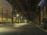 This is a night-time image of a street in Berlin, Germany. The cityscape is illuminated by artificial lights from street lights, buildings, and road surfaces. The scene is characterized by the dark sky and the tints and shades created by the lights. The symmetrical design of the bridge and the underpass adds to the urban feel of the image. The metal beams, tires, and wheels provide a sense of the hustle and bustle of the city. This photo captures the vibrant atmosphere of Berlin at night.