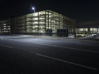 This is an image of a modern architecture building in Berlin, Germany. The city's metropolitan area is depicted at night, with the road and parking lot covered in asphalt. The artificial light from the street lights and the building illuminates the scene, creating a contrast with the dark surroundings. This photo captures the urban vibe of Berlin's architecture and showcases the modernity of the city. It represents the vibrant city nightlife and the bustling atmosphere of one of Europe's most popular destinations.