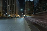 This image captures the vibrancy and energy of downtown Chicago, Illinois, USA. The modern architecture of the city creates a captivating cityscape, with straight roads and concrete streets stretching out into the night. The city lights illuminate the urban design, leaving streaks of light that create a sense of motion blur. This photo perfectly embodies the essence of city life in a metropolitan area. With its bustling streets, towering buildings, and artifical light, it showcases the beauty and energy of Chicago's urban landscape at night.