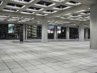 a large empty square on the outside of a building at night time with many windows
