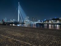 This stunning photo captures the beauty of a city at night. The image shows a bridge elegantly stretching over a body of water, surrounded by towering skyscrapers and modern architecture. The city skyline is illuminated by street lights, casting a warm glow on the cobblestone road surfaces below. The clear sky above provides a perfect backdrop for the captivating scene. This picture truly encapsulates the essence of urban life in Holland, Netherlands.