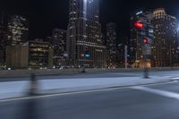 an empty city freeway at night with high rise buildings in the background with white and yellow lights