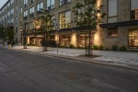 This is an image of a modern architecture building in an urban neighborhood in Toronto, Canada. The building is illuminated by street lights and artificial light, creating a vibrant and atmospheric scene at night. The street is lined with warehouses and shops, while the brick walls of the surrounding buildings add a classic touch. In the distance, contrails can be seen in the sky, symbolizing the city's bustling activity. This photo captures the essence of Toronto's art district and showcases the combination of classic and modern architecture in the city.