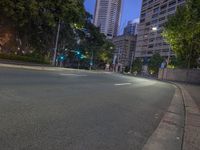 A bustling city scene at night, with illuminated office buildings and skyscrapers lining the streets. The clear sky above contrasts with the artificial light from streetlights and traffic lights. A vibrant urban landscape with a mix of business and residential areas.