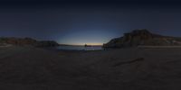 a picture taken with the 360 - angle lens at night of a scenic view of cliffs near a sea