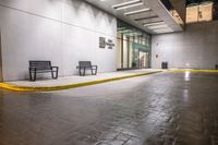 This image captures the essence of urban life in Canada. The photo features empty benches lined up outside a building in Montreal, with the city lights reflecting on the wet sidewalk. The rainy night adds to the ambiance, highlighting the urban design of the city. The artificial light adds depth and contrast to the photo, creating a captivating scene. This photo showcases the vibrant city life of Montreal, a city known for its unique blend of urban and natural beauty.