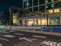 an image of outside of the night time building with the lights turned on and the streets empty