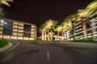 palm trees and buildings at night, blurry picture, seen from a passing vehicle