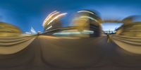 A nighttime view of an empty park area in Chicago. Blurred motion of buildings creates a sense of movement. The city's modern architecture is highlighted by the artificial light and reflections. A glimpse into the vibrant city life of Chicago at dusk.