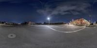 an empty parking lot that is near some stores at night time with lights on the buildings and sky in the background