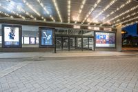 a building with a brick facade at night in front of a theater door with lights on it