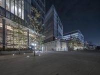 This stock photo showcases a stunning view of a modern architecture building at night in the bustling business district of Shanghai, China. The building features a sleek facade and mixed-use design, with an open space and parking lot on one side. The surrounding area is illuminated with artificial lighting, creating a vibrant cityscape. This image captures the urban energy and metropolitan atmosphere of Shanghai, a thriving metropolis known for its impressive skyline and urban design. The photo highlights the combination of concrete surfaces, trees, and cars, representing the dynamic city life in Shanghai's business district. Perfect for illustrating concepts related to architecture, cityscapes, urban design, and the vibrant business scene in China.