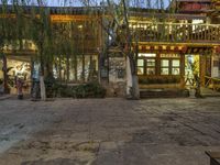 Nighttime view of a quaint village in Yunnan, China. Cobblestone roads and historic architecture create an enchanting atmosphere. Warm yellow lights illuminate the facade of a residential building. Experience the charm of old town Lijiang.