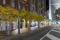 This is an image of a nighttime street in Wellington, New Zealand. The photo showcases the city's architectural design with classic buildings and storefronts illuminated by artificial yellow street lights. The road surface is made of asphalt and there are lined lanes for transport. The urban neighborhood is bustling with city life, showcasing the vibrant atmosphere of Wellington. The image captures the essence of this metropolitan area and its unique urban design. It is a representation of the dynamic and lively street scene in Wellington.