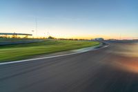 A race track in Nürburgring, Germany, under a clear European dawn sky. Asphalt road curves with motion blur as vehicles race around the iconic Nordschleife. Racing enthusiasts enjoy the break of day on this legendary road.