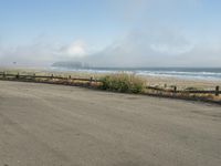 This image captures a person riding a bike on a coastal road in California, USA. The low fog creates a gloomy atmosphere as it rises from behind the rider and partially obscures the hills in the distance. The road, made of asphalt, stretches along the shore line and is surrounded by sand, grass, and beach. The clear sky above contrasts with the grey sky and cloud formations, adding to the natural environment. Armco barriers line the road, providing safety and structure. This photo represents a serene day on the California coast.