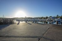 A coastal road leading to the city, with a clear sky and the sun shining down. The asphalt surface reflects the sunlight, creating a stunning landscape at dawn. A pier extends into the ocean, providing a picturesque view of the water.