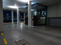 This image showcases an empty commercial space in a city at night. The low coastal water and buildings with glass facades provide a stunning view of the ocean. The composite material flooring and concrete surface creates a modern and urban atmosphere. The area is illuminated by street lights and the lights from the city windows above. The interior design of the hall showcases an open space perfectly suited for a property such as a condominium or office building. This photo represents the urban design and real estate opportunities in the city at night.