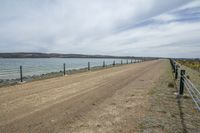 A picturesque coastal landscape with a road surface lined with fences. The land lot is covered in grass and surrounded by trees. The beautiful blue ocean and sand street complete the serene scene.