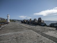 A coastal landscape featuring a lighthouse and a pier. The concrete street leads to the water, creating a picturesque scene. The clear sky and hard shadows add to the scenic beauty.