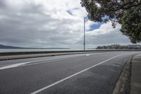 An empty road runs parallel to the coastal horizon, with the vast ocean in view. The road surface, lined with vegetation and a curb, leads to a picturesque landscape. A serene day by the ocean.