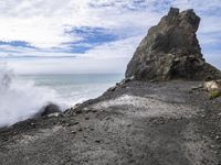 This image captures the rugged beauty of California's coastal landscape along the Pacific Coast Highway. The grey sky sets a dramatic backdrop as waves crash onto the shoreline, surrounded by rocks and rock formations. The view extends towards the water, showcasing the natural beauty of the ocean. The beach is a mix of gravel and dirt, perfect for off-road adventures. This photo represents the recreational opportunities and scenic views that Big Sur has to offer. It also showcases the coastal cliffs and promontories that make this area so unique.