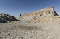 A stunning mountain landscape in British Columbia's Okanagan Valley. The rugged terrain is dominated by a massive mountain range with slopes of sand and rocks. A skateboarder defies gravity, soaring through the open skies.