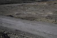 A scenic dirt road winding its way through the rugged and elevated landscape of Utah's San Rafael Swell. The barren desert terrain features red rock formations, gravel, rocks, and dirt ground. The road surface is made up of asphalt and bedrock, surrounded by grass and occasional rocks on either side. The clear grey sky above adds to the natural beauty of this remote and breathtaking location. This is 4 Corners Mine Road, a thrilling off-road track perfect for nature enthusiasts and geology lovers seeking an adventure in the heart of Canyonlands.