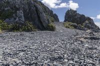 a small rocky road on top of a mountain with clouds overhead it is in the daytime