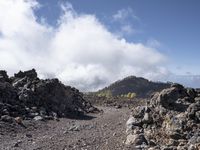 the trail is surrounded by rocks and trees and clouds behind it and the view of the mountains