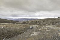 the man is riding the motorcycle in the desert under the cloudy sky and hills with rocks and gravel