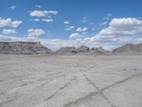 Off-road adventure in the vast open space of the Utah desert. Factory Butte dominates the landscape with its unique rock formations. Clouds dot the clear sky, casting shadows on the dirt and gravel tracks. A perfect day for nature enthusiasts.