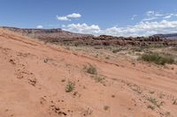 This stock photo features a captivating view of Lock Hart Road, a red dirt road that cuts through the vast and desolate landscape of Utah's desert. Surrounded by rugged mountains, the road winds its way through the wilderness, offering an exciting off-road experience. The striking red rock formations, scattered bushes, and rocky terrain create a picturesque scene. The clear blue sky with scattered clouds adds to the natural beauty of the area. This image showcases the unique geology and formation of the region, with its wadi-like features and makhtesh-like structures. It captures the essence of the vast canyonlands and sand streets that define this natural environment.