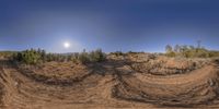 a wide lensed image of some dirt hills and bushes as well as the sun