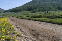 A scenic view of the lush vegetation and mountainous landscape in Washington Gulch, Colorado. Clear skies and a gravel road provide the perfect setting for outdoor recreation and off-road activities. Arrive at this natural environment and explore the beauty of Crested Butte.
