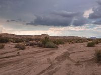 A desert landscape in California with rugged mountains in the background. The dry riverbed and gloomy sky create a sense of gloom. A dirt road winds through the terrain, surrounded by vegetation.