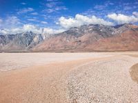 Off-road adventure on a rugged mountain trail. The dirt and gravel surface adds to the excitement of the journey. The landscape offers stunning views of highland plains and cloud-covered mountains.