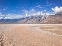 a barren desert is shown with mountains in the background and some clouds in the sky