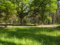 This image captures the beautiful landscape of Berlin, Germany. The picture shows a dirt road surrounded by a lush forest and green vegetation. The grassy surface and gravel track provide a serene and off-road experience. Tall trees with branches and trunks shade the area, creating a peaceful atmosphere. The groundcover is covered in a variety of terrestrial plants, enhancing the natural beauty of the location. This photo showcases the stunning nature and tranquility that can be found in the heart of Berlin.