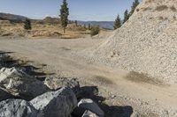 A rugged off-road track in the elevated mountains of British Columbia. The clear sky contrasts with the elevated mountain range and rugged landscape. The track winds through the Kelowna region, showcasing the unique beauty of the Okanagan Valley.