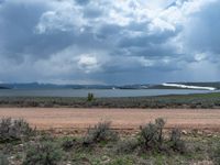 A scenic rural landscape in Utah, USA. The off-road track winds its way through gravel and sand streets, with a beautiful lake in the background. Clouds dot the clear blue sky on a sunny day.