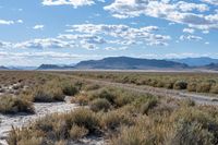 A rugged off-road track winds through the highland landscape of California. Desert vegetation and grass-covered mountains create a picturesque scene under a clear sky.