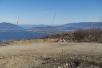 A rugged off-road track in the highlands of British Columbia, Canada. The clear sky highlights the scenic mountain landscape. Gravel banks along the coastal shore add to the natural beauty of the Okanagan Valley near Kelowna.