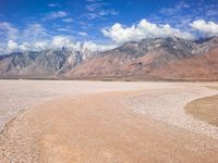 A rugged off-road track winding through a mountain range. The gravel and dirt surface contrasts with the surrounding grass and plain. Cumulus clouds add a dramatic touch to this natural landscape.