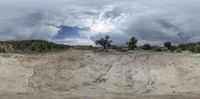 a photo of a view from a distance of sand and trees, with dark clouds in the background