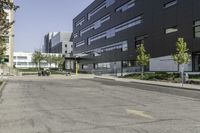 a fire hydrant is sitting in the middle of an empty street outside an office building
