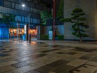 A night scene in the city, showcasing a wet road surrounded by office buildings. Street lights illuminate the urban landscape, creating a dramatic and vibrant atmosphere. City life thrives under the artificial light.
